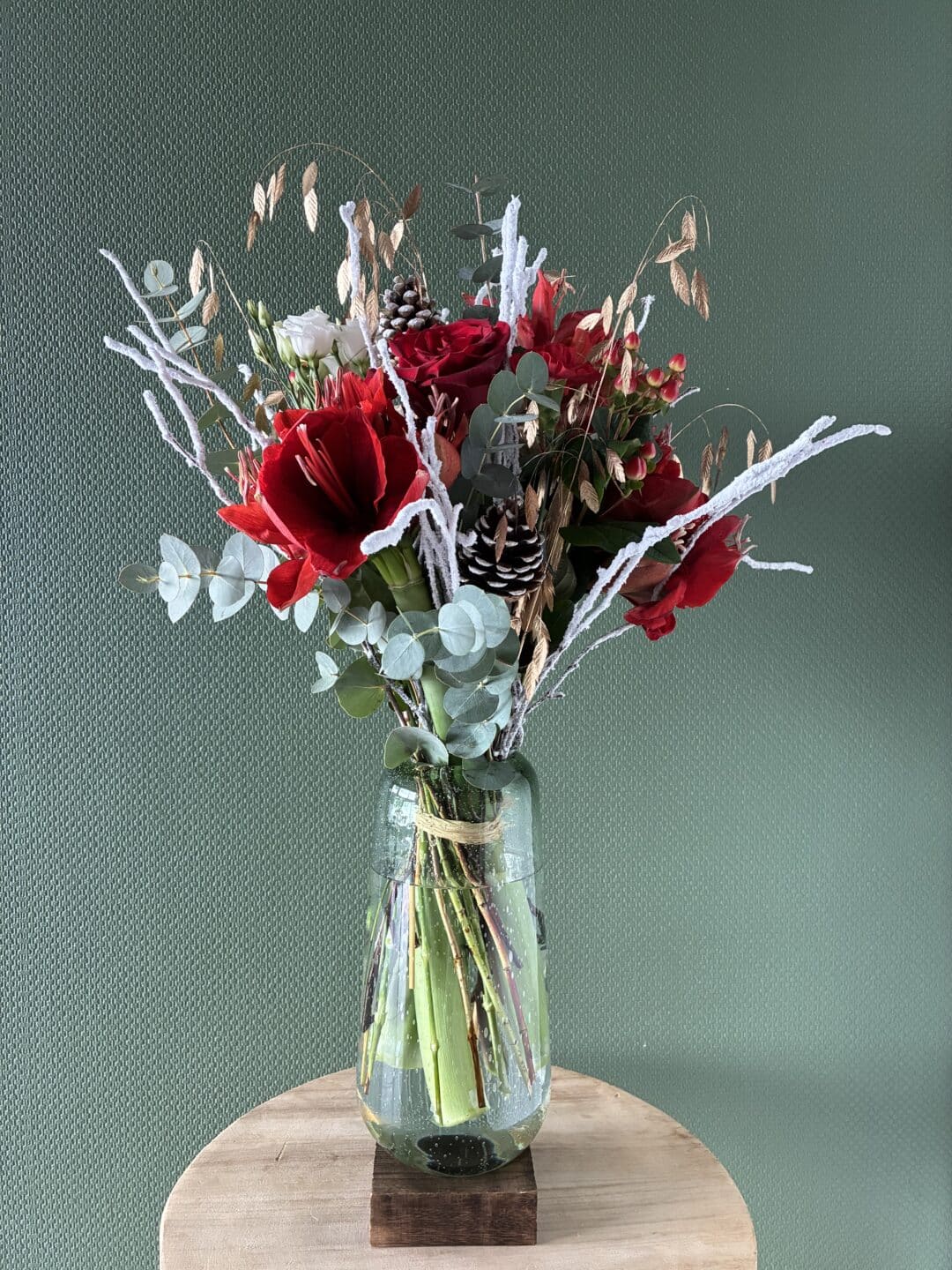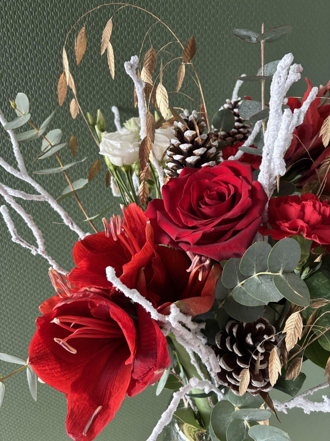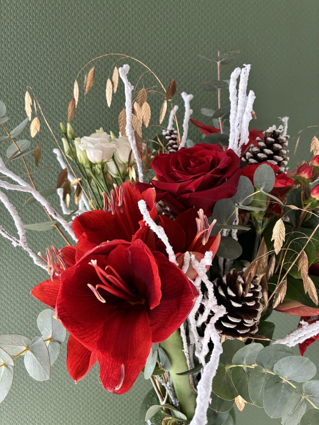 Bouquet avec fleurs rouges d’amaryllis, roses, baies d’hypéricum et feuillages dorés et blanc.